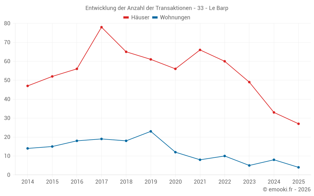 Der Durchschnittspreis auf den 27 Hausgeschäften der letzten 6 Monate in der Gemeinde Le Barp betrug 3 154 € pro Quadratmeter für einen mittleren Immobilienwert von 322 670 €. Über diesen Zeitraum hinweg lagen 60% der Transaktionen zwischen 2 497 und 3 480 € pro Quadratmeter (vom 2. bis zum 8. Dezil).