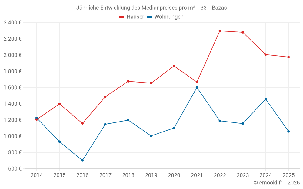 Der Durchschnittspreis auf den 18 Wohnungstransaktionen der letzten 24 Monate in der Gemeinde Bazas betrug 1 245 € pro Quadratmeter für einen mittleren Immobilienwert von 141 500 €. Über diesen Zeitraum hinweg lagen 60% der Transaktionen zwischen 919 und 1 897 € pro Quadratmeter (vom 2. bis zum 8. Dezil).