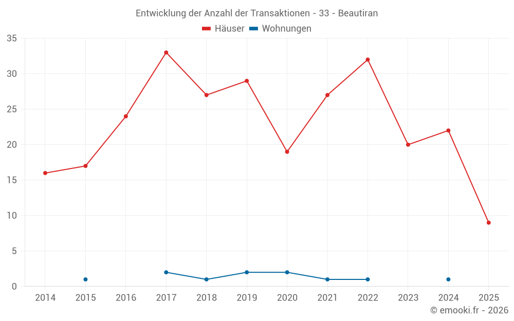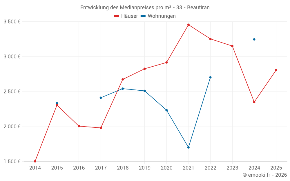 Der Durchschnittspreis auf den 21 Hausgeschäften der letzten 12 Monate in der Gemeinde Beautiran betrug 2 390 € pro Quadratmeter für einen mittleren Immobilienwert von 282 000 €. Über diesen Zeitraum hinweg lagen 60% der Transaktionen zwischen 1 550 und 3 291 € pro Quadratmeter (vom 2. bis zum 8. Dezil).