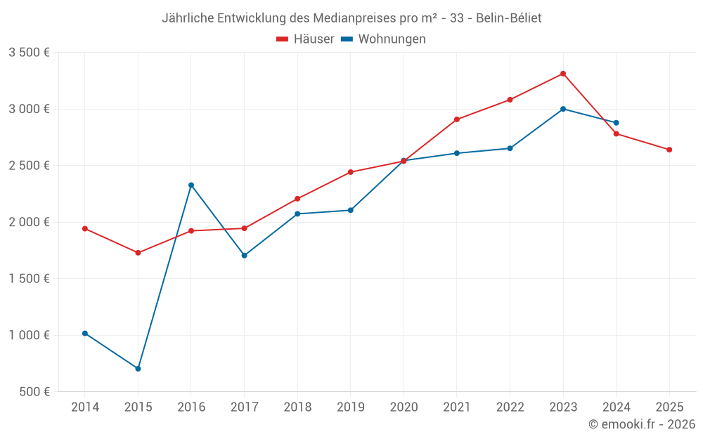 Der Durchschnittspreis auf den 31 Hausgeschäften der letzten 6 Monate in der Gemeinde Belin-Béliet betrug 2 640 € pro Quadratmeter für einen mittleren Immobilienwert von 254 000 €. Über diesen Zeitraum hinweg lagen 60% der Transaktionen zwischen 2 232 und 3 119 € pro Quadratmeter (vom 2. bis zum 8. Dezil).