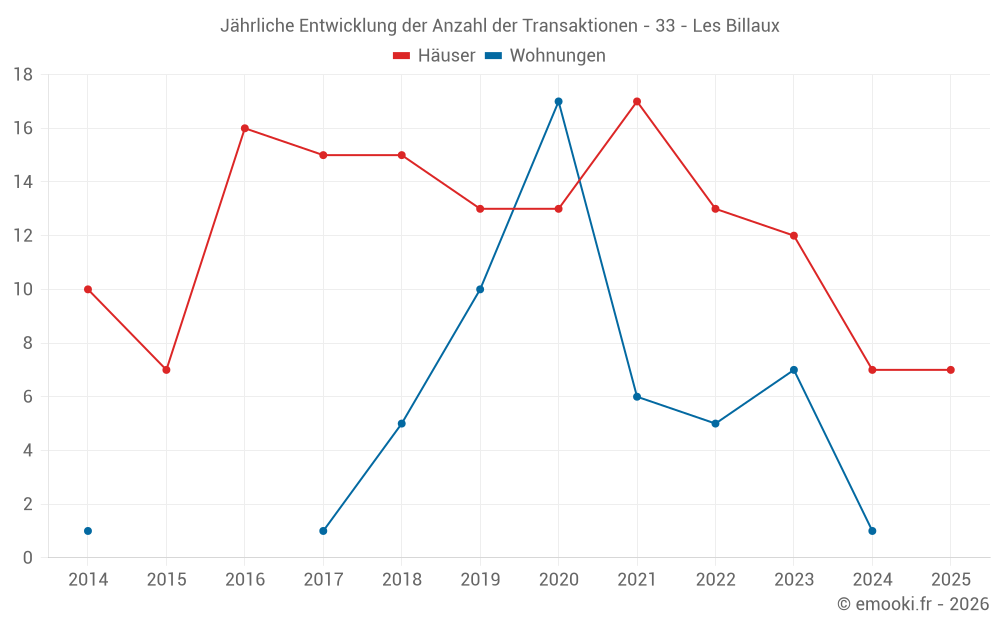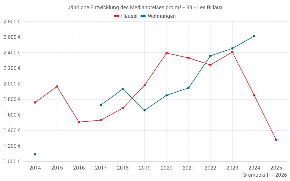 Der Durchschnittspreis auf den 19 Hausgeschäften der letzten 24 Monate in der Gemeinde Les Billaux betrug 1 771 € pro Quadratmeter für einen mittleren Immobilienwert von 185 000 €. Über diesen Zeitraum hinweg lagen 60% der Transaktionen zwischen 1 019 und 2 372 € pro Quadratmeter (vom 2. bis zum 8. Dezil).