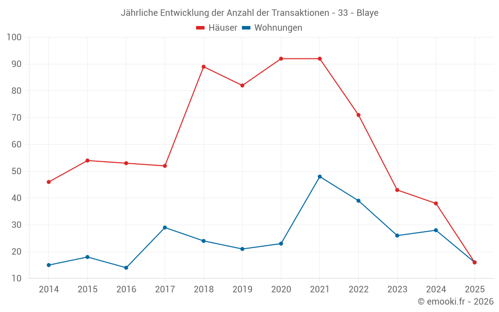 Der Durchschnittspreis auf den 33 Wohnungstransaktionen der letzten 12 Monate in der Gemeinde Blaye betrug 1 659 € pro Quadratmeter für einen mittleren Immobilienwert von 75 000 €. Über diesen Zeitraum hinweg lagen 60% der Transaktionen zwischen 1 326 und 1 875 € pro Quadratmeter (vom 2. bis zum 8. Dezil).