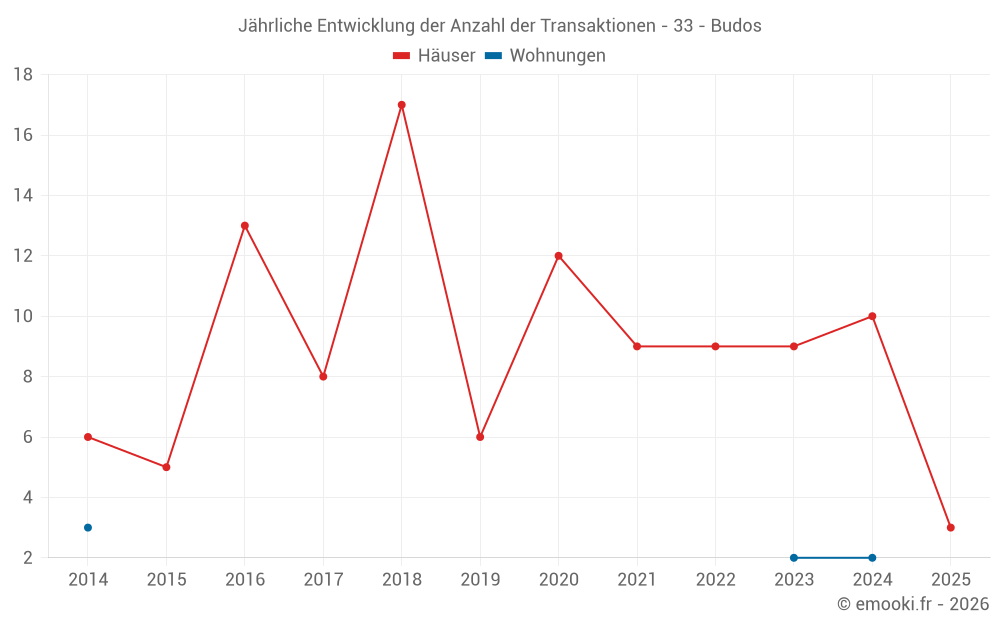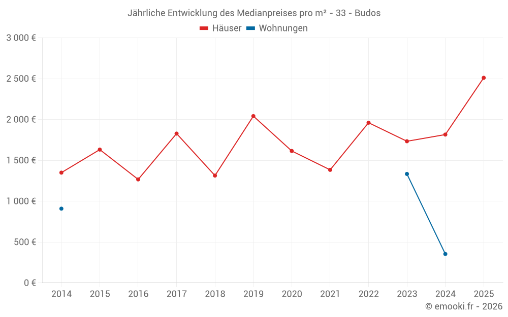 Der Durchschnittspreis auf den 19 Hausgeschäften der letzten 24 Monate in der Gemeinde Budos betrug 1 675 € pro Quadratmeter für einen mittleren Immobilienwert von 235 000 €. Über diesen Zeitraum hinweg lagen 60% der Transaktionen zwischen 971 und 2 529 € pro Quadratmeter (vom 2. bis zum 8. Dezil).