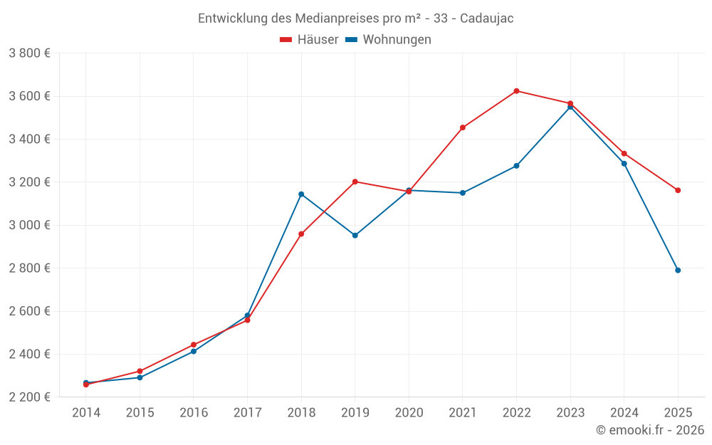 Der Durchschnittspreis auf den 29 Wohnungstransaktionen der letzten 24 Monate in der Gemeinde Cadaujac betrug 3 333 € pro Quadratmeter für einen mittleren Immobilienwert von 160 000 €. Über diesen Zeitraum hinweg lagen 60% der Transaktionen zwischen 2 801 und 3 622 € pro Quadratmeter (vom 2. bis zum 8. Dezil).