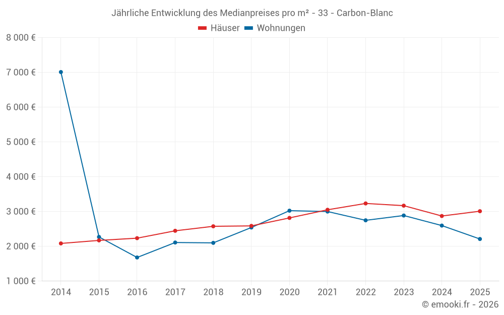 Der Durchschnittspreis auf den 24 Wohnungstransaktionen der letzten 12 Monate in der Gemeinde Carbon-Blanc betrug 2 320 € pro Quadratmeter für einen mittleren Immobilienwert von 152 222 €. Über diesen Zeitraum hinweg lagen 60% der Transaktionen zwischen 1 946 und 2 759 € pro Quadratmeter (vom 2. bis zum 8. Dezil).
