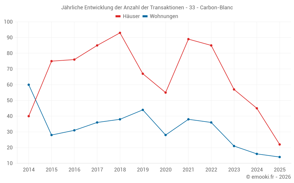 Der Durchschnittspreis auf den 22 Hausgeschäften der letzten 6 Monate in der Gemeinde Carbon-Blanc betrug 3 010 € pro Quadratmeter für einen mittleren Immobilienwert von 251 000 €. Über diesen Zeitraum hinweg lagen 60% der Transaktionen zwischen 2 229 und 3 567 € pro Quadratmeter (vom 2. bis zum 8. Dezil).
