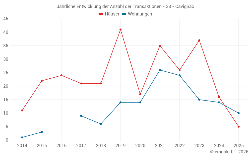 Der Durchschnittspreis auf den 19 Wohnungstransaktionen der letzten 12 Monate in der Gemeinde Cavignac betrug 1 930 € pro Quadratmeter für einen mittleren Immobilienwert von 95 000 €. Über diesen Zeitraum hinweg lagen 60% der Transaktionen zwischen 1 749 und 2 046 € pro Quadratmeter (vom 2. bis zum 8. Dezil).