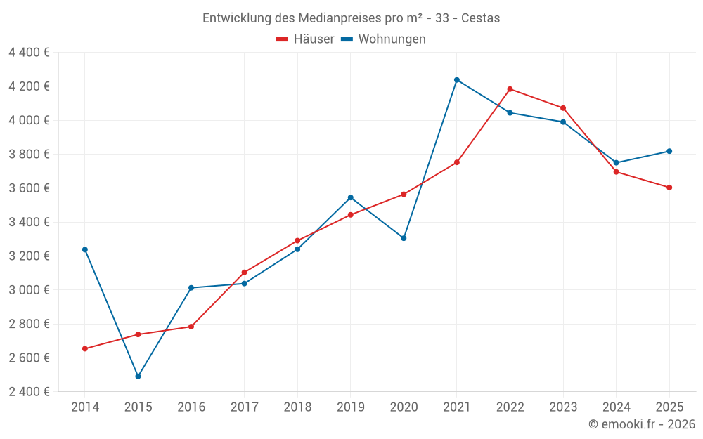 Der Durchschnittspreis auf den 38 Hausgeschäften der letzten 6 Monate in der Gemeinde Cestas betrug 3 604 € pro Quadratmeter für einen mittleren Immobilienwert von 344 590 €. Über diesen Zeitraum hinweg lagen 60% der Transaktionen zwischen 2 679 und 4 136 € pro Quadratmeter (vom 2. bis zum 8. Dezil).