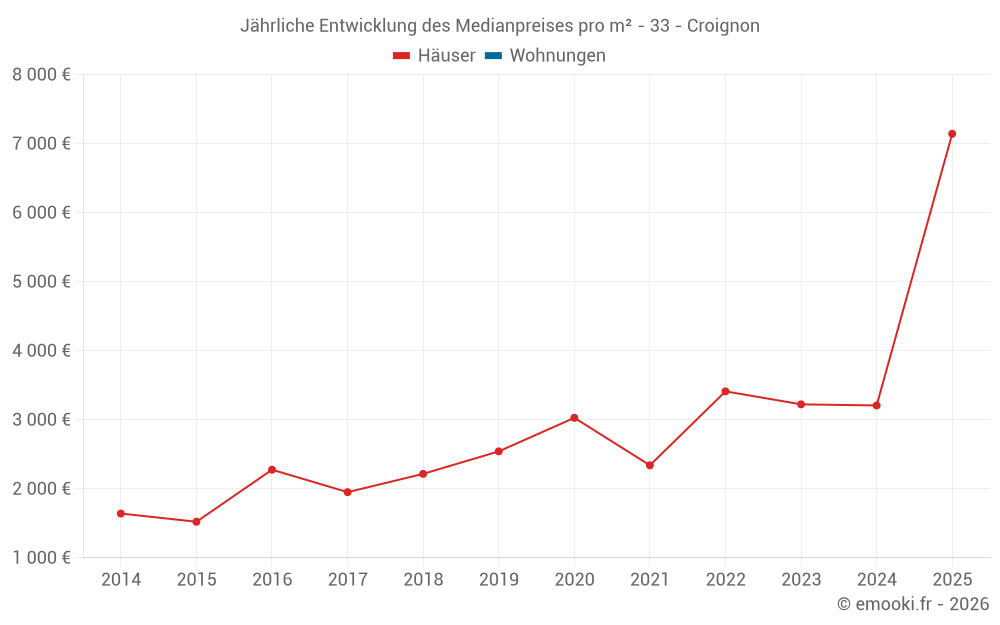 Der Durchschnittspreis auf den 14 Hausgeschäften der letzten 24 Monate in der Gemeinde Croignon betrug 3 214 € pro Quadratmeter für einen mittleren Immobilienwert von 390 150 €. Über diesen Zeitraum hinweg lagen 60% der Transaktionen zwischen 3 052 und 3 556 € pro Quadratmeter (vom 2. bis zum 8. Dezil).