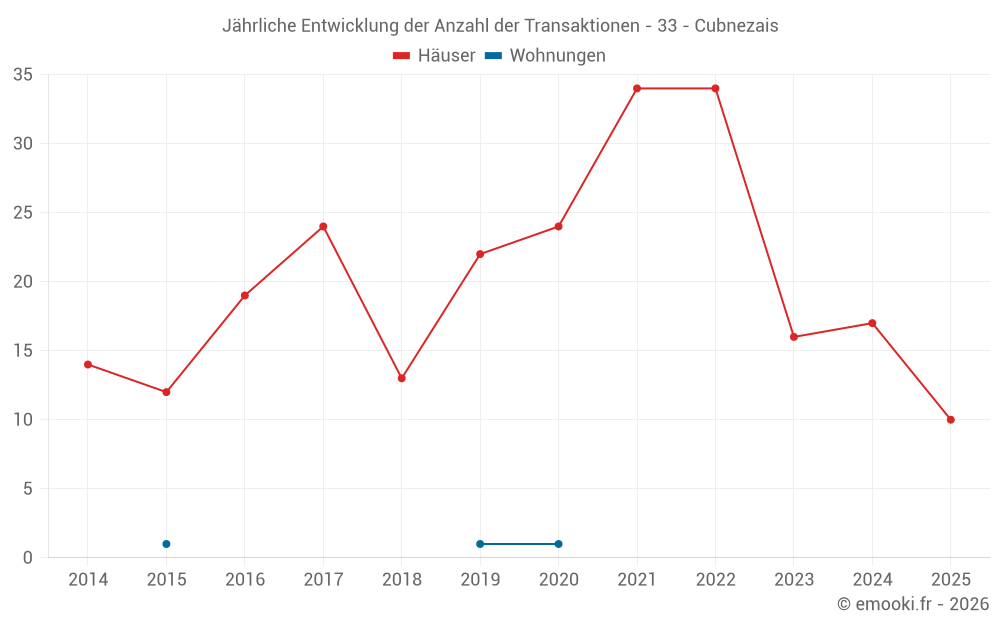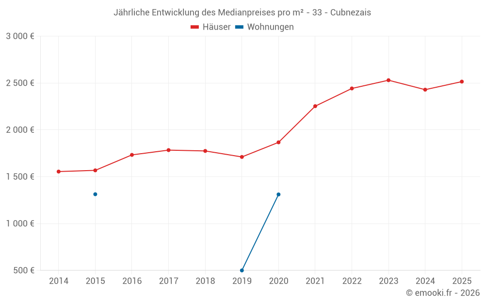 Der Durchschnittspreis auf den 19 Hausgeschäften der letzten 12 Monate in der Gemeinde Cubnezais betrug 2 732 € pro Quadratmeter für einen mittleren Immobilienwert von 250 400 €. Über diesen Zeitraum hinweg lagen 60% der Transaktionen zwischen 1 526 und 2 944 € pro Quadratmeter (vom 2. bis zum 8. Dezil).