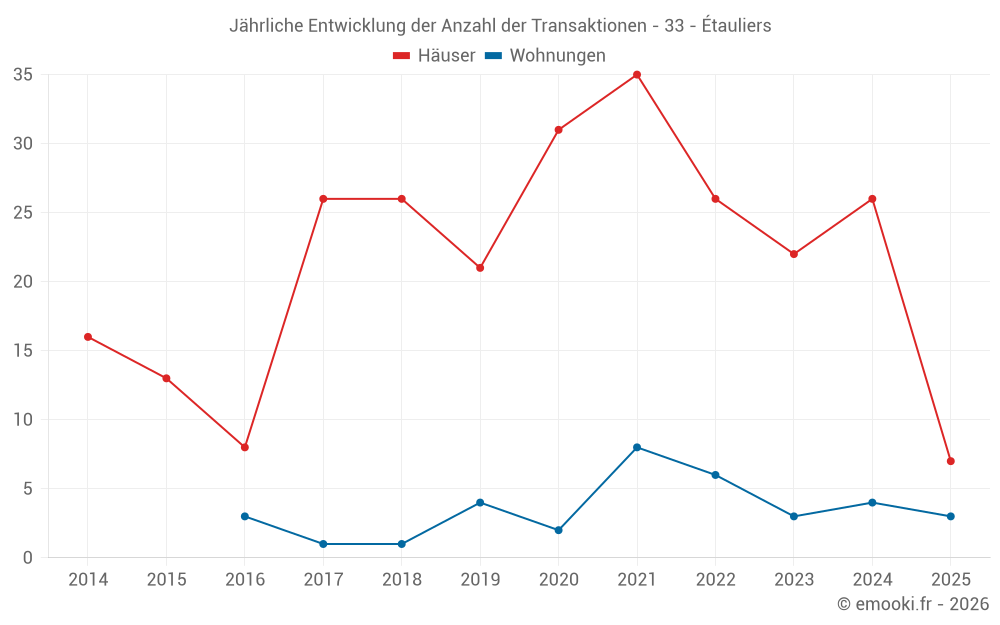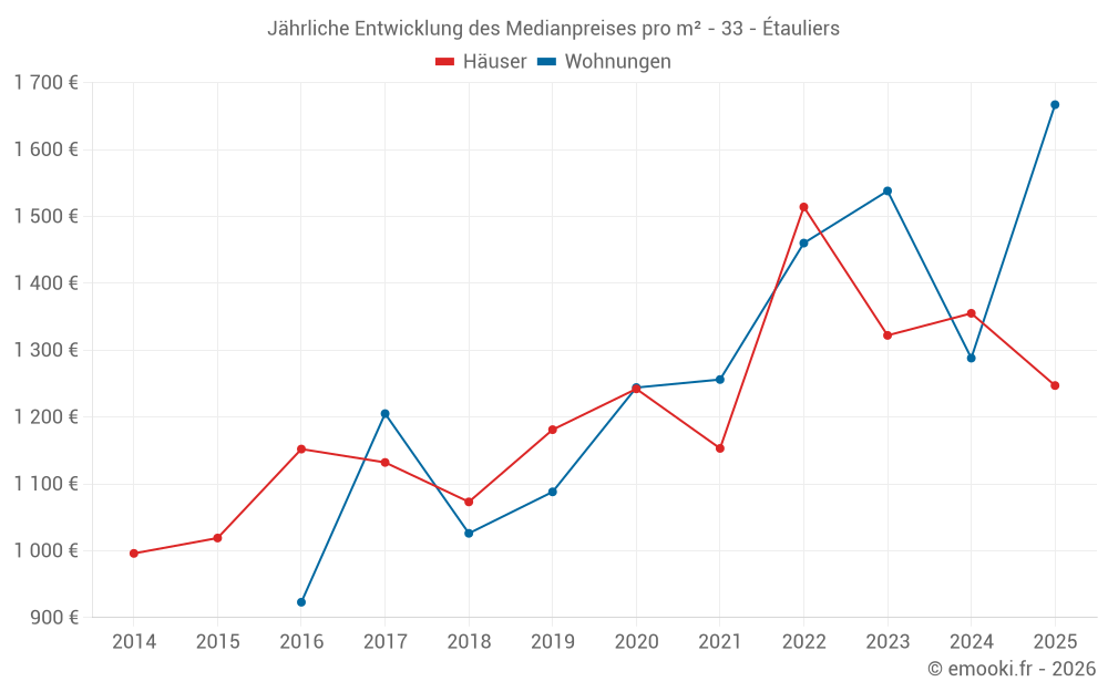 Der Durchschnittspreis auf den 21 Hausgeschäften der letzten 12 Monate in der Gemeinde Étauliers betrug 1 397 € pro Quadratmeter für einen mittleren Immobilienwert von 95 000 €. Über diesen Zeitraum hinweg lagen 60% der Transaktionen zwischen 1 000 und 1 833 € pro Quadratmeter (vom 2. bis zum 8. Dezil).