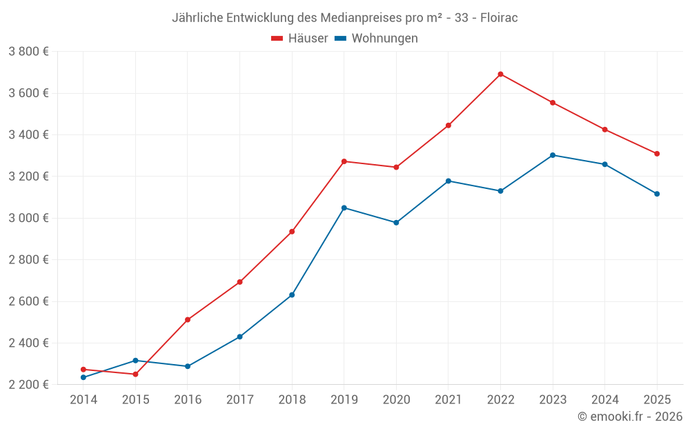 Der Durchschnittspreis auf den 32 Hausgeschäften der letzten 6 Monate in der Gemeinde Floirac betrug 3 309 € pro Quadratmeter für einen mittleren Immobilienwert von 274 850 €. Über diesen Zeitraum hinweg lagen 60% der Transaktionen zwischen 2 929 und 3 739 € pro Quadratmeter (vom 2. bis zum 8. Dezil).