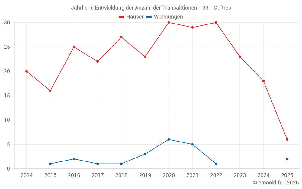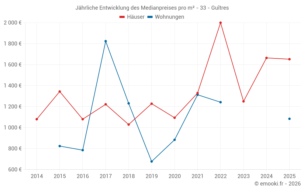 Der Durchschnittspreis auf den 16 Hausgeschäften der letzten 12 Monate in der Gemeinde Guîtres betrug 1 588 € pro Quadratmeter für einen mittleren Immobilienwert von 170 151 €. Über diesen Zeitraum hinweg lagen 60% der Transaktionen zwischen 1 125 und 2 631 € pro Quadratmeter (vom 2. bis zum 8. Dezil).