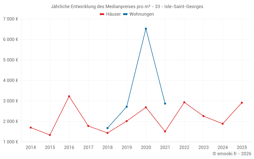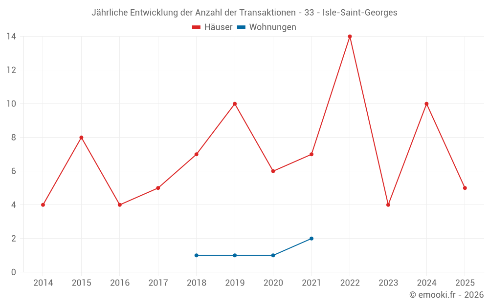 Der Durchschnittspreis auf den 18 Hausgeschäften der letzten 24 Monate in der Gemeinde Isle-Saint-Georges betrug 2 257 € pro Quadratmeter für einen mittleren Immobilienwert von 214 600 €. Über diesen Zeitraum hinweg lagen 60% der Transaktionen zwischen 859 und 2 949 € pro Quadratmeter (vom 2. bis zum 8. Dezil).