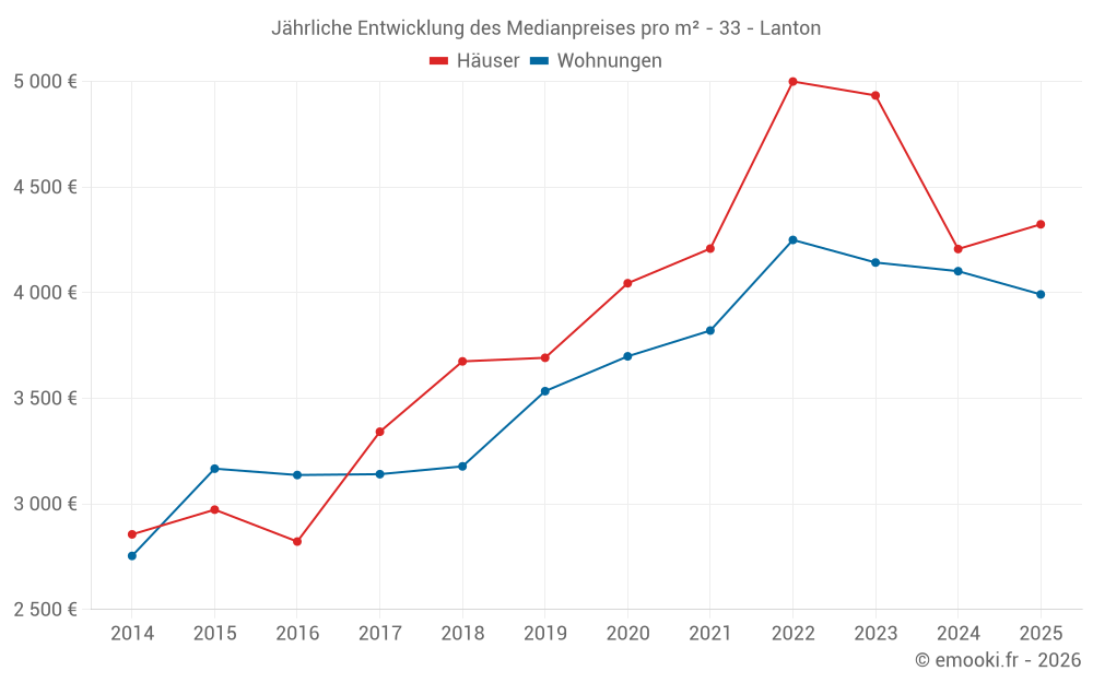 Der Durchschnittspreis auf den 40 Hausgeschäften der letzten 6 Monate in der Gemeinde Lanton betrug 4 324 € pro Quadratmeter für einen mittleren Immobilienwert von 344 375 €. Über diesen Zeitraum hinweg lagen 60% der Transaktionen zwischen 3 395 und 5 000 € pro Quadratmeter (vom 2. bis zum 8. Dezil).