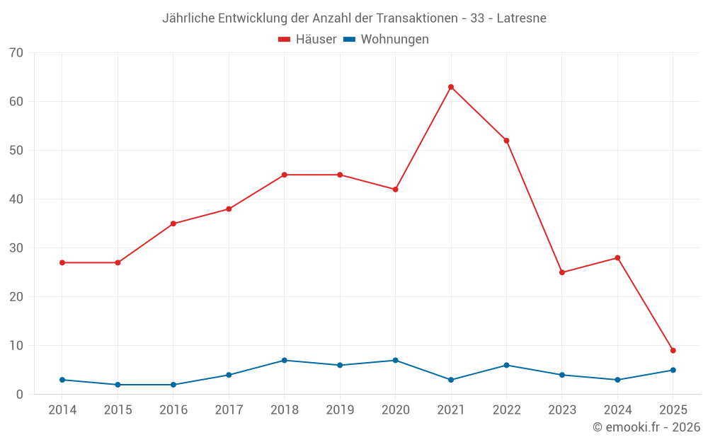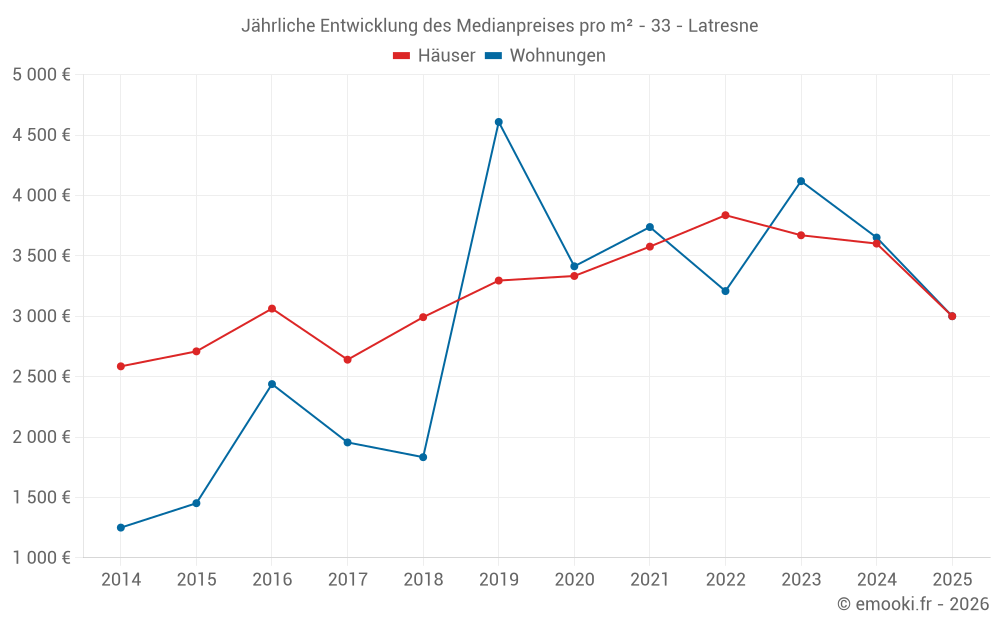 Der Durchschnittspreis auf den 23 Hausgeschäften der letzten 12 Monate in der Gemeinde Latresne betrug 3 370 € pro Quadratmeter für einen mittleren Immobilienwert von 294 500 €. Über diesen Zeitraum hinweg lagen 60% der Transaktionen zwischen 2 830 und 4 047 € pro Quadratmeter (vom 2. bis zum 8. Dezil).