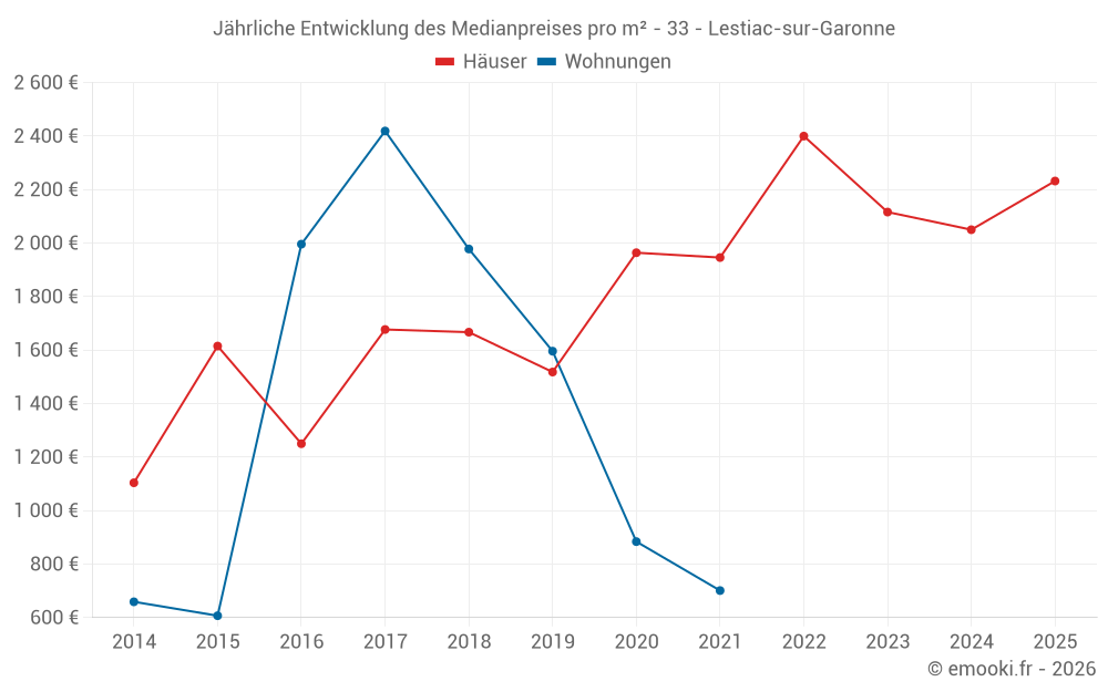 Der Durchschnittspreis auf den 16 Hausgeschäften der letzten 24 Monate in der Gemeinde Lestiac-sur-Garonne betrug 2 116 € pro Quadratmeter für einen mittleren Immobilienwert von 162 750 €. Über diesen Zeitraum hinweg lagen 60% der Transaktionen zwischen 1 743 und 2 804 € pro Quadratmeter (vom 2. bis zum 8. Dezil).