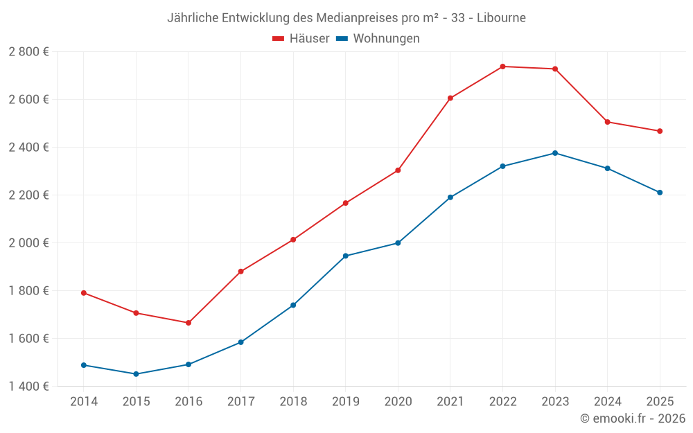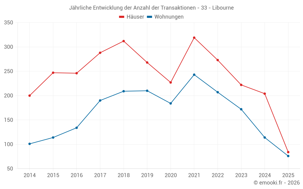 Der Durchschnittspreis auf den 41 Hausgeschäften der letzten 3 Monate in der Gemeinde Libourne betrug 2 237 € pro Quadratmeter für einen mittleren Immobilienwert von 238 660 €. Über diesen Zeitraum hinweg lagen 60% der Transaktionen zwischen 1 522 und 2 943 € pro Quadratmeter (vom 2. bis zum 8. Dezil).