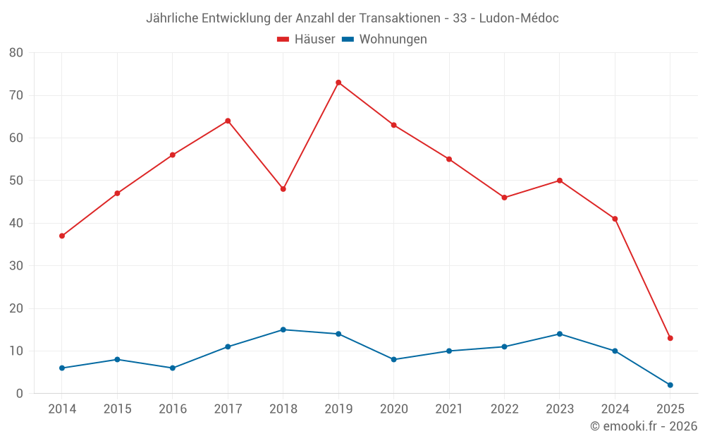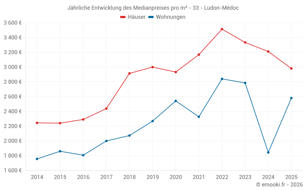 Der Durchschnittspreis auf den 38 Hausgeschäften der letzten 12 Monate in der Gemeinde Ludon-Médoc betrug 3 194 € pro Quadratmeter für einen mittleren Immobilienwert von 305 000 €. Über diesen Zeitraum hinweg lagen 60% der Transaktionen zwischen 2 626 und 3 474 € pro Quadratmeter (vom 2. bis zum 8. Dezil).