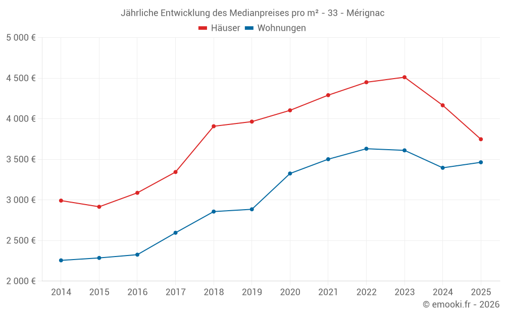 Der Durchschnittspreis auf den 63 Hausgeschäften der letzten 3 Monate in der Gemeinde Mérignac betrug 3 734 € pro Quadratmeter für einen mittleren Immobilienwert von 388 000 €. Über diesen Zeitraum hinweg lagen 60% der Transaktionen zwischen 3 174 und 4 639 € pro Quadratmeter (vom 2. bis zum 8. Dezil).