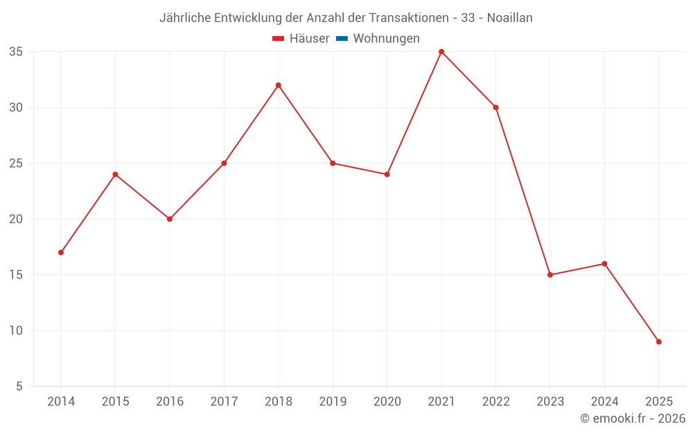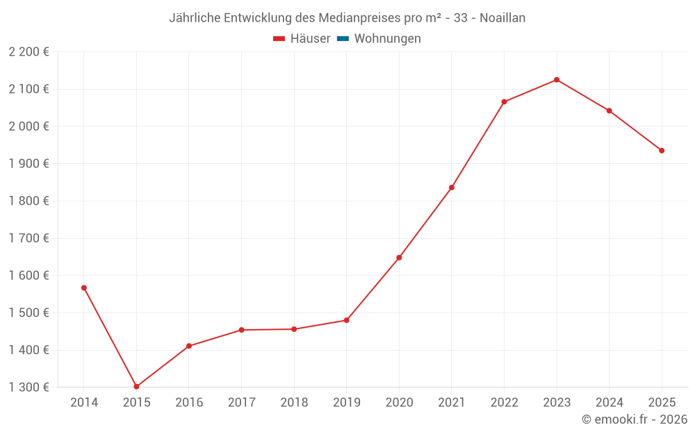 Der Durchschnittspreis auf den 19 Hausgeschäften der letzten 12 Monate in der Gemeinde Noaillan betrug 2 041 € pro Quadratmeter für einen mittleren Immobilienwert von 201 000 €. Über diesen Zeitraum hinweg lagen 60% der Transaktionen zwischen 1 110 und 2 528 € pro Quadratmeter (vom 2. bis zum 8. Dezil).
