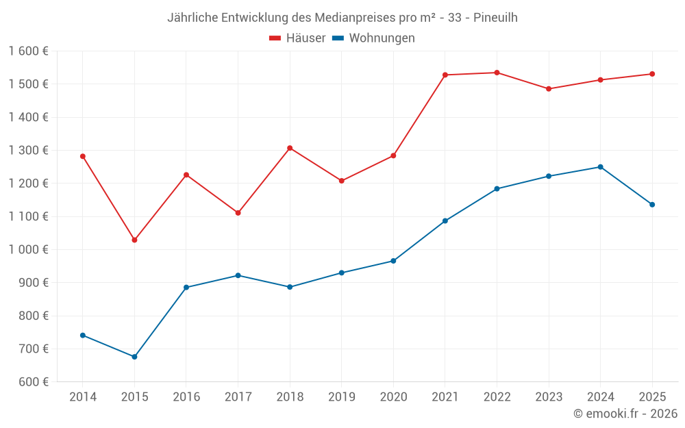 Der Durchschnittspreis auf den 24 Wohnungstransaktionen der letzten 12 Monate in der Gemeinde Pineuilh betrug 1 236 € pro Quadratmeter für einen mittleren Immobilienwert von 58 500 €. Über diesen Zeitraum hinweg lagen 60% der Transaktionen zwischen 1 088 und 1 328 € pro Quadratmeter (vom 2. bis zum 8. Dezil).