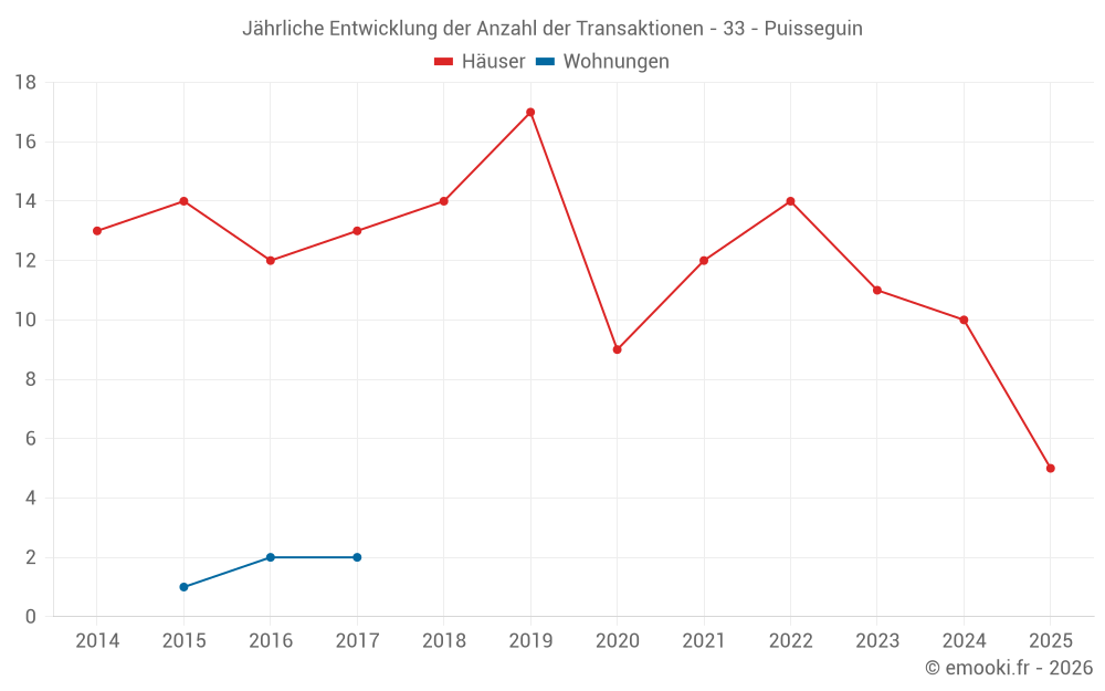 Der Durchschnittspreis auf den 17 Hausgeschäften der letzten 24 Monate in der Gemeinde Puisseguin betrug 1 714 € pro Quadratmeter für einen mittleren Immobilienwert von 152 450 €. Über diesen Zeitraum hinweg lagen 60% der Transaktionen zwischen 1 099 und 2 520 € pro Quadratmeter (vom 2. bis zum 8. Dezil).