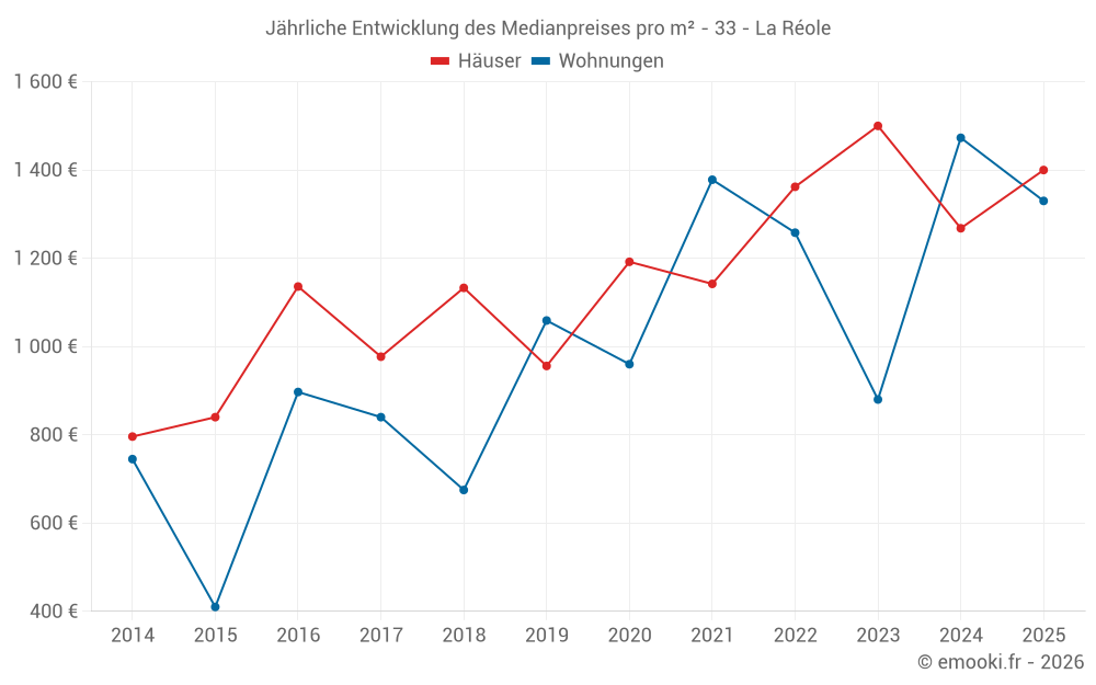 Der Durchschnittspreis auf den 35 Hausgeschäften der letzten 12 Monate in der Gemeinde La Réole betrug 1 268 € pro Quadratmeter für einen mittleren Immobilienwert von 124 000 €. Über diesen Zeitraum hinweg lagen 60% der Transaktionen zwischen 616 und 1 857 € pro Quadratmeter (vom 2. bis zum 8. Dezil).