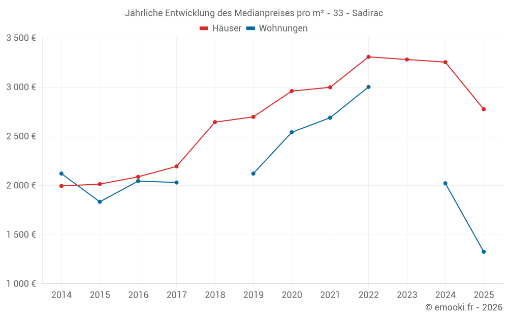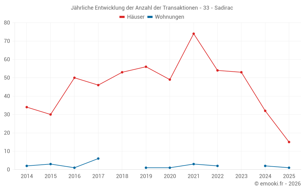 Der Durchschnittspreis auf den 33 Hausgeschäften der letzten 12 Monate in der Gemeinde Sadirac betrug 3 074 € pro Quadratmeter für einen mittleren Immobilienwert von 285 000 €. Über diesen Zeitraum hinweg lagen 60% der Transaktionen zwischen 2 416 und 3 507 € pro Quadratmeter (vom 2. bis zum 8. Dezil).