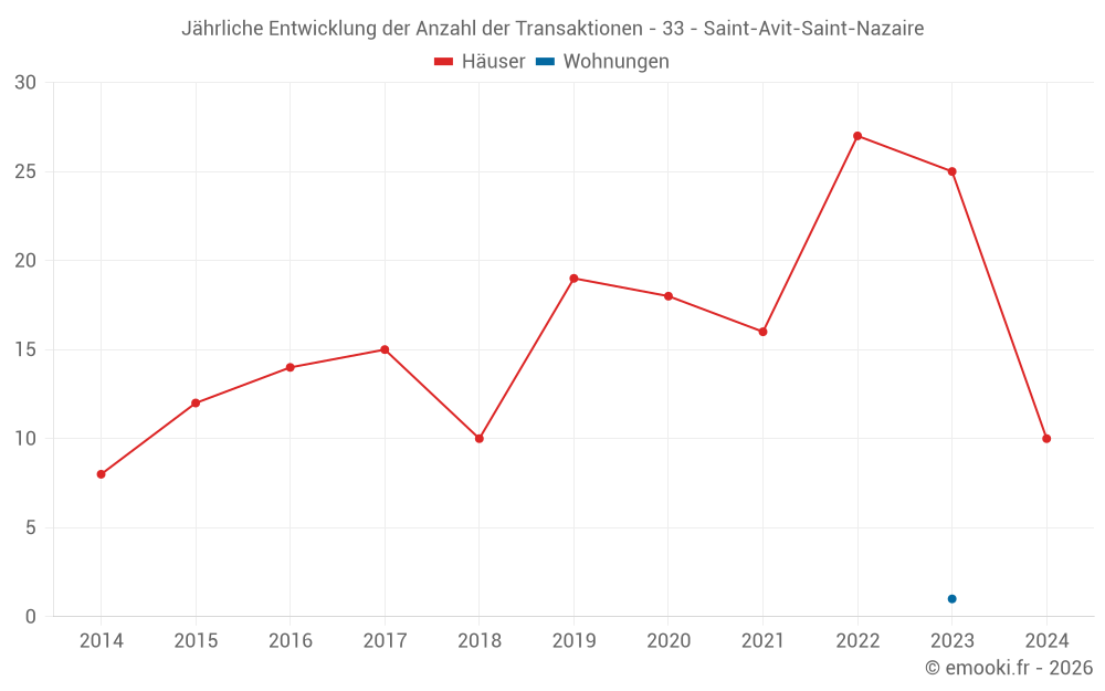 Der Durchschnittspreis auf den 21 Hausgeschäften der letzten 24 Monate in der Gemeinde Saint-Avit-Saint-Nazaire betrug 1 424 € pro Quadratmeter für einen mittleren Immobilienwert von 148 470 €. Über diesen Zeitraum hinweg lagen 60% der Transaktionen zwischen 1 000 und 2 000 € pro Quadratmeter (vom 2. bis zum 8. Dezil).
