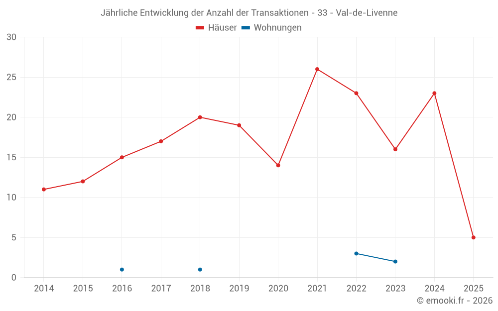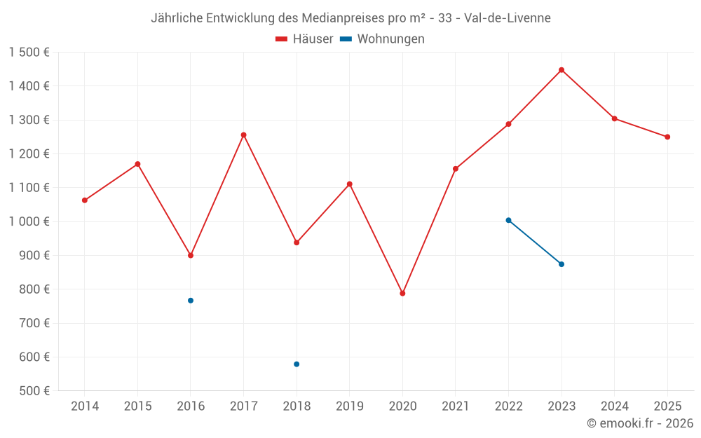 Der Durchschnittspreis auf den 20 Hausgeschäften der letzten 12 Monate in der Gemeinde Val-de-Livenne betrug 1 286 € pro Quadratmeter für einen mittleren Immobilienwert von 137 500 €. Über diesen Zeitraum hinweg lagen 60% der Transaktionen zwischen 745 und 1 797 € pro Quadratmeter (vom 2. bis zum 8. Dezil).