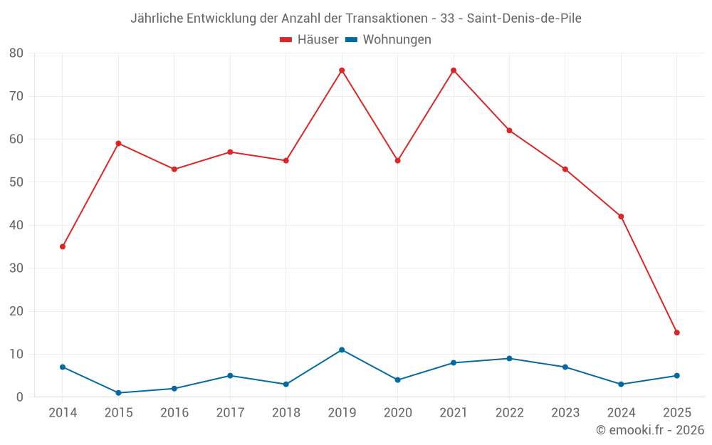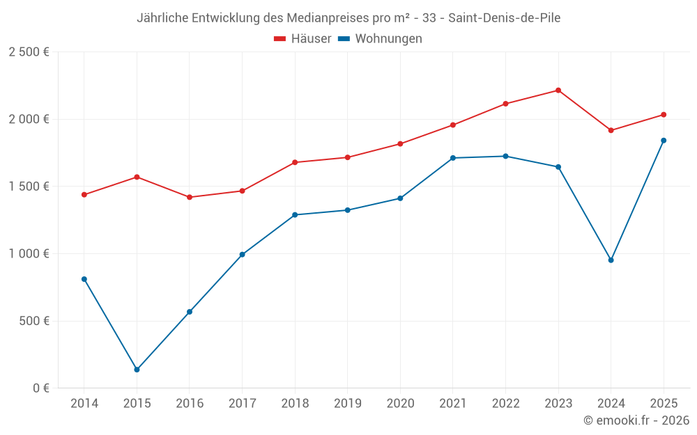 Der Durchschnittspreis auf den 43 Hausgeschäften der letzten 12 Monate in der Gemeinde Saint-Denis-de-Pile betrug 1 845 € pro Quadratmeter für einen mittleren Immobilienwert von 177 000 €. Über diesen Zeitraum hinweg lagen 60% der Transaktionen zwischen 1 230 und 2 373 € pro Quadratmeter (vom 2. bis zum 8. Dezil).