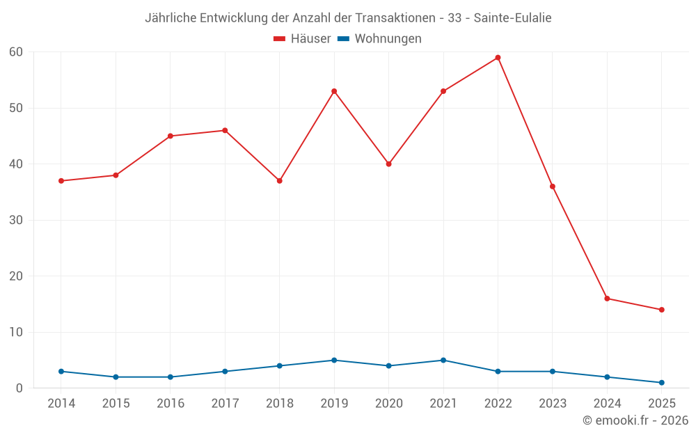 Der Durchschnittspreis auf den 23 Hausgeschäften der letzten 12 Monate in der Gemeinde Sainte-Eulalie betrug 2 700 € pro Quadratmeter für einen mittleren Immobilienwert von 300 000 €. Über diesen Zeitraum hinweg lagen 60% der Transaktionen zwischen 1 912 und 3 502 € pro Quadratmeter (vom 2. bis zum 8. Dezil).