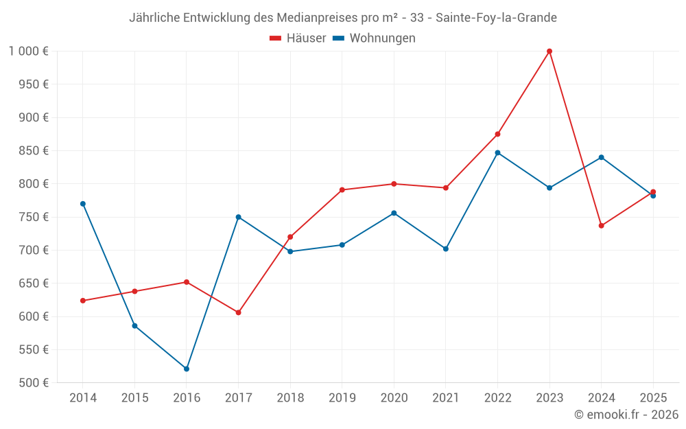 Der Durchschnittspreis auf den 26 Wohnungstransaktionen der letzten 12 Monate in der Gemeinde Sainte-Foy-la-Grande betrug 796 € pro Quadratmeter für einen mittleren Immobilienwert von 48 900 €. Über diesen Zeitraum hinweg lagen 60% der Transaktionen zwischen 625 und 1 087 € pro Quadratmeter (vom 2. bis zum 8. Dezil).