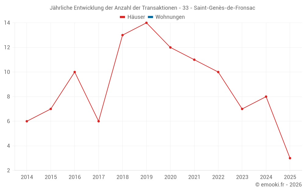 Der Durchschnittspreis auf den 16 Hausgeschäften der letzten 24 Monate in der Gemeinde Saint-Genès-de-Fronsac betrug 2 431 € pro Quadratmeter für einen mittleren Immobilienwert von 267 500 €. Über diesen Zeitraum hinweg lagen 60% der Transaktionen zwischen 1 647 und 3 024 € pro Quadratmeter (vom 2. bis zum 8. Dezil).