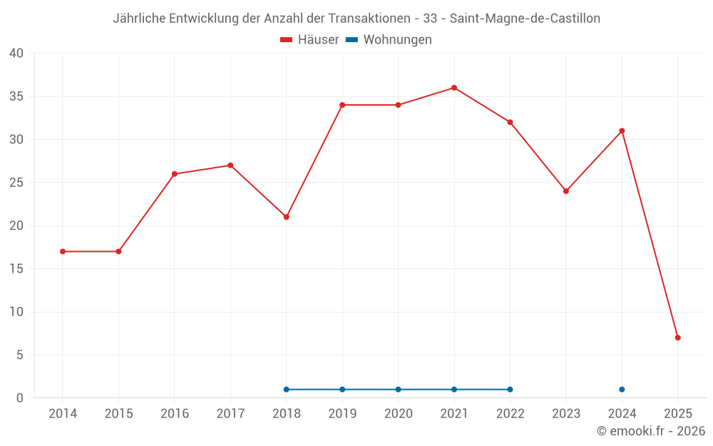 Der Durchschnittspreis auf den 24 Hausgeschäften der letzten 12 Monate in der Gemeinde Saint-Magne-de-Castillon betrug 2 374 € pro Quadratmeter für einen mittleren Immobilienwert von 202 250 €. Über diesen Zeitraum hinweg lagen 60% der Transaktionen zwischen 1 751 und 3 124 € pro Quadratmeter (vom 2. bis zum 8. Dezil).