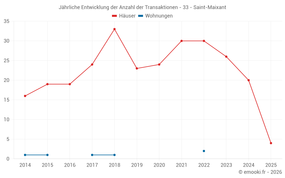 Der Durchschnittspreis auf den 17 Hausgeschäften der letzten 12 Monate in der Gemeinde Saint-Maixant betrug 2 281 € pro Quadratmeter für einen mittleren Immobilienwert von 240 000 €. Über diesen Zeitraum hinweg lagen 60% der Transaktionen zwischen 2 050 und 2 839 € pro Quadratmeter (vom 2. bis zum 8. Dezil).