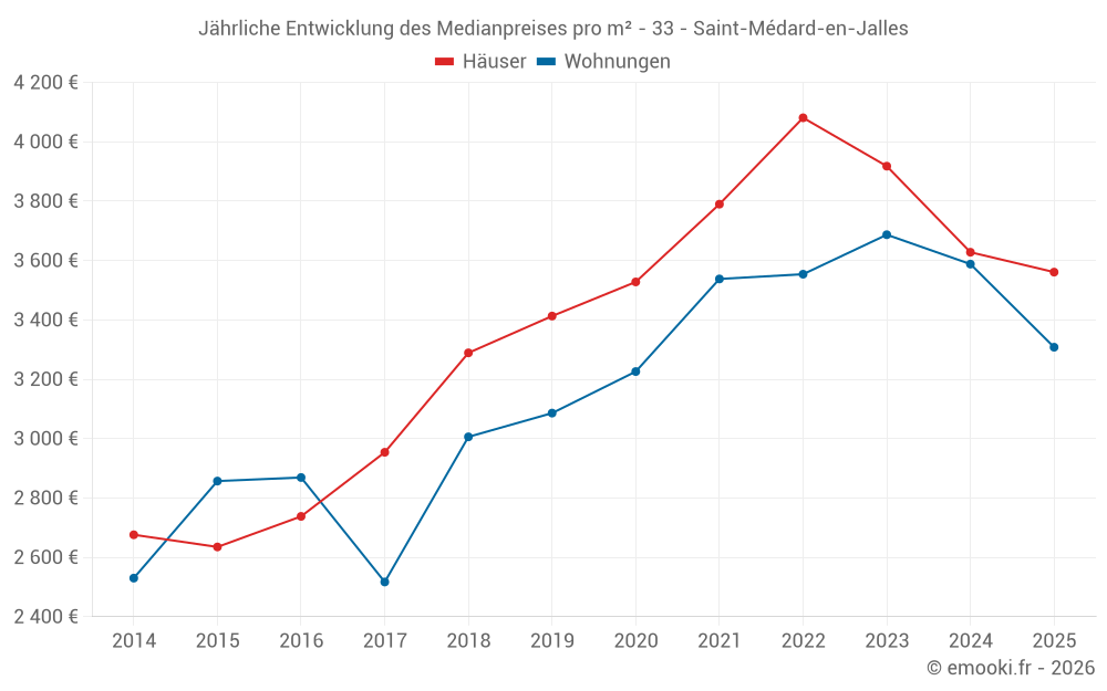 Der Durchschnittspreis auf den 38 Wohnungstransaktionen der letzten 6 Monate in der Gemeinde Saint-Médard-en-Jalles betrug 3 308 € pro Quadratmeter für einen mittleren Immobilienwert von 184 500 €. Über diesen Zeitraum hinweg lagen 60% der Transaktionen zwischen 3 072 und 3 907 € pro Quadratmeter (vom 2. bis zum 8. Dezil).