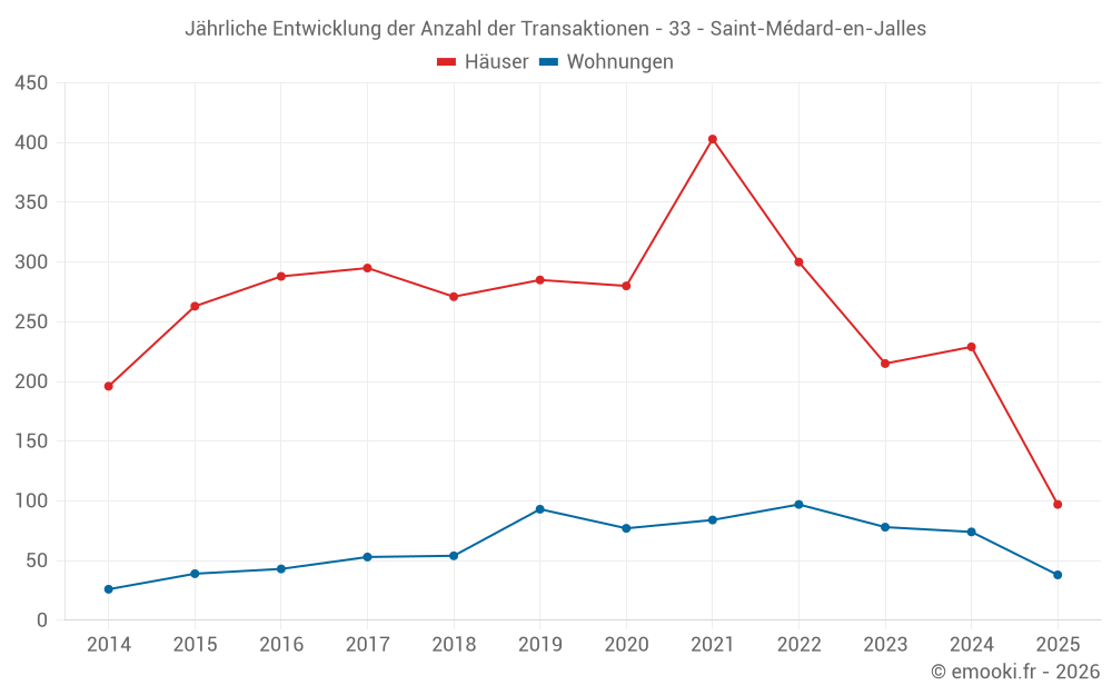 Der Durchschnittspreis auf den 41 Hausgeschäften der letzten 3 Monate in der Gemeinde Saint-Médard-en-Jalles betrug 3 485 € pro Quadratmeter für einen mittleren Immobilienwert von 363 000 €. Über diesen Zeitraum hinweg lagen 60% der Transaktionen zwischen 2 670 und 4 261 € pro Quadratmeter (vom 2. bis zum 8. Dezil).