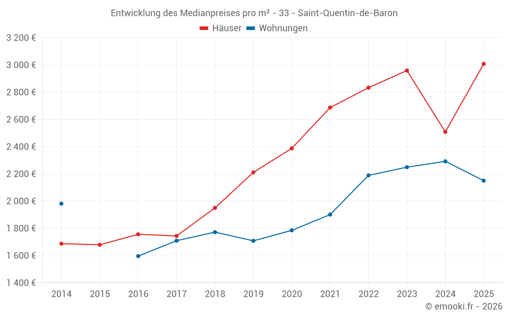 Der Durchschnittspreis auf den 22 Wohnungstransaktionen der letzten 12 Monate in der Gemeinde Saint-Quentin-de-Baron betrug 2 178 € pro Quadratmeter für einen mittleren Immobilienwert von 85 500 €. Über diesen Zeitraum hinweg lagen 60% der Transaktionen zwischen 1 821 und 2 462 € pro Quadratmeter (vom 2. bis zum 8. Dezil).