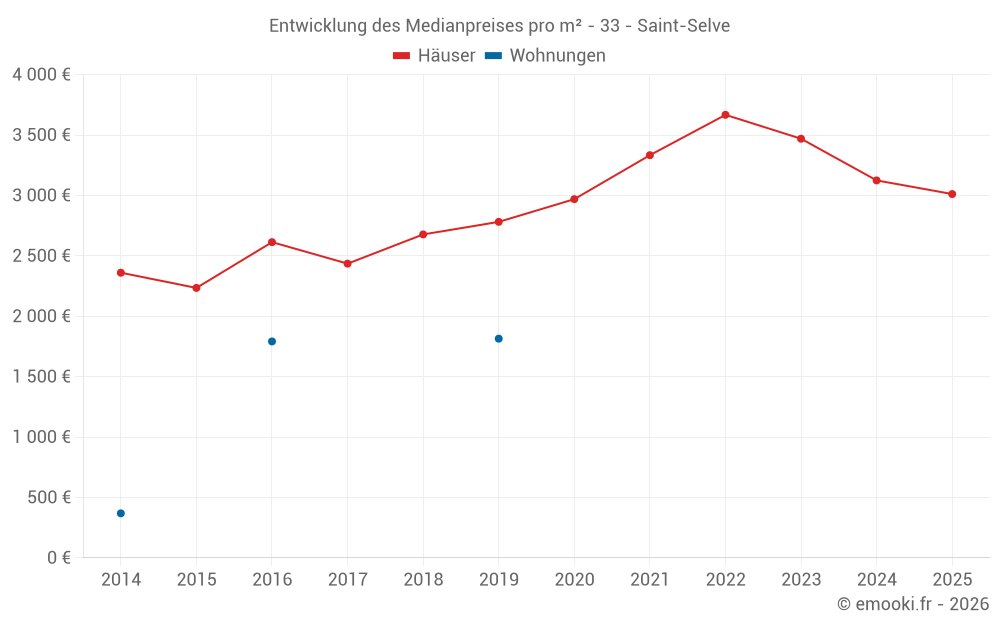 Der Durchschnittspreis auf den 31 Hausgeschäften der letzten 12 Monate in der Gemeinde Saint-Selve betrug 3 056 € pro Quadratmeter für einen mittleren Immobilienwert von 320 000 €. Über diesen Zeitraum hinweg lagen 60% der Transaktionen zwischen 2 315 und 3 393 € pro Quadratmeter (vom 2. bis zum 8. Dezil).