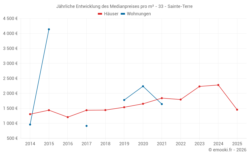Der Durchschnittspreis auf den 37 Hausgeschäften der letzten 24 Monate in der Gemeinde Sainte-Terre betrug 2 105 € pro Quadratmeter für einen mittleren Immobilienwert von 212 000 €. Über diesen Zeitraum hinweg lagen 60% der Transaktionen zwischen 1 467 und 2 885 € pro Quadratmeter (vom 2. bis zum 8. Dezil).