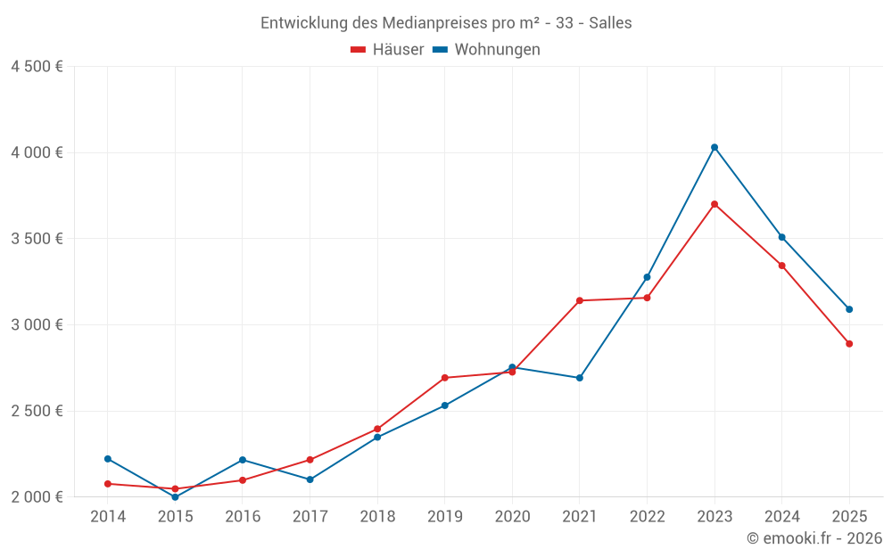 Der Durchschnittspreis auf den 34 Hausgeschäften der letzten 6 Monate in der Gemeinde Salles betrug 2 890 € pro Quadratmeter für einen mittleren Immobilienwert von 289 704 €. Über diesen Zeitraum hinweg lagen 60% der Transaktionen zwischen 1 896 und 3 646 € pro Quadratmeter (vom 2. bis zum 8. Dezil).
