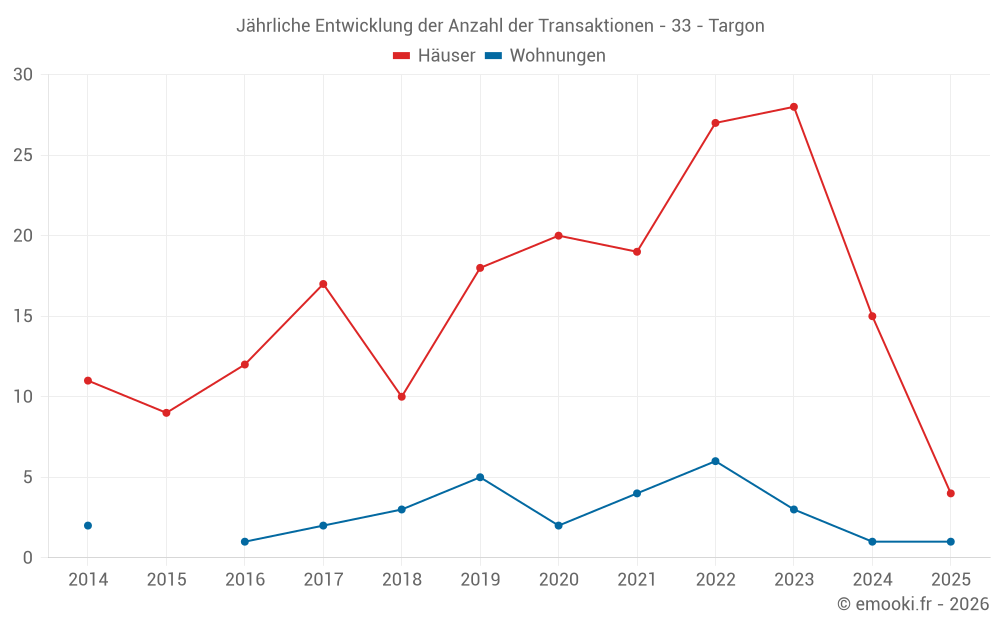 Der Durchschnittspreis auf den 33 Hausgeschäften der letzten 24 Monate in der Gemeinde Targon betrug 2 329 € pro Quadratmeter für einen mittleren Immobilienwert von 242 900 €. Über diesen Zeitraum hinweg lagen 60% der Transaktionen zwischen 1 446 und 2 705 € pro Quadratmeter (vom 2. bis zum 8. Dezil).