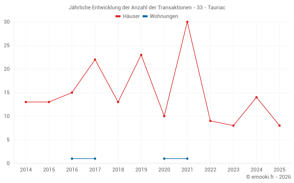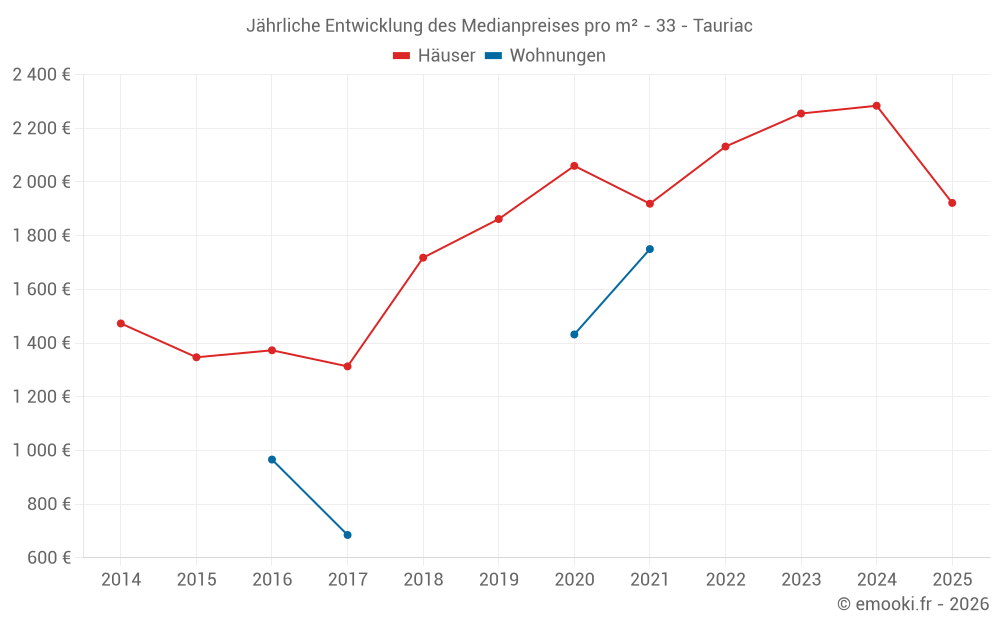 Der Durchschnittspreis auf den 20 Hausgeschäften der letzten 12 Monate in der Gemeinde Tauriac betrug 2 086 € pro Quadratmeter für einen mittleren Immobilienwert von 186 000 €. Über diesen Zeitraum hinweg lagen 60% der Transaktionen zwischen 1 622 und 2 393 € pro Quadratmeter (vom 2. bis zum 8. Dezil).