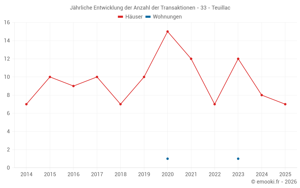 Der Durchschnittspreis auf den 19 Hausgeschäften der letzten 24 Monate in der Gemeinde Teuillac betrug 2 179 € pro Quadratmeter für einen mittleren Immobilienwert von 216 170 €. Über diesen Zeitraum hinweg lagen 60% der Transaktionen zwischen 1 484 und 2 558 € pro Quadratmeter (vom 2. bis zum 8. Dezil).