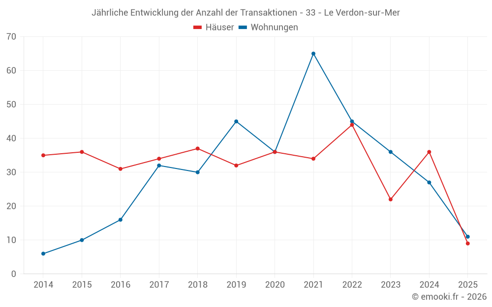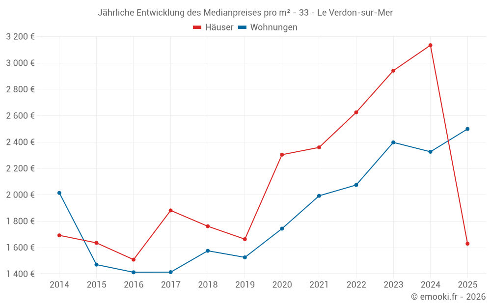 Der Durchschnittspreis auf den 30 Hausgeschäften der letzten 12 Monate in der Gemeinde Le Verdon-sur-Mer betrug 2 918 € pro Quadratmeter für einen mittleren Immobilienwert von 200 250 €. Über diesen Zeitraum hinweg lagen 60% der Transaktionen zwischen 1 630 und 3 881 € pro Quadratmeter (vom 2. bis zum 8. Dezil).