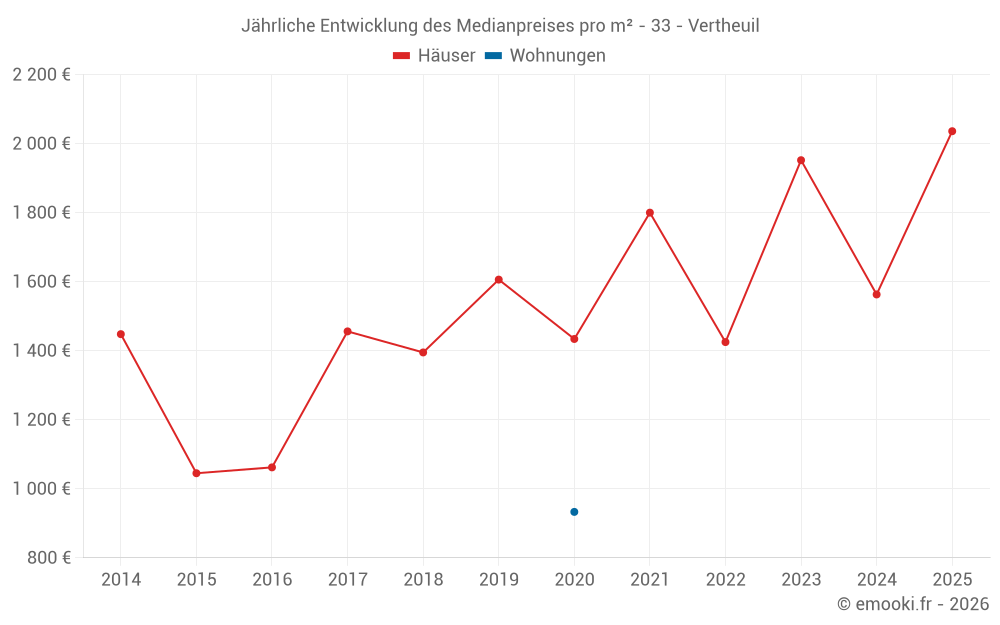Der Durchschnittspreis auf den 18 Hausgeschäften der letzten 12 Monate in der Gemeinde Vertheuil betrug 1 865 € pro Quadratmeter für einen mittleren Immobilienwert von 160 260 €. Über diesen Zeitraum hinweg lagen 60% der Transaktionen zwischen 1 211 und 2 473 € pro Quadratmeter (vom 2. bis zum 8. Dezil).