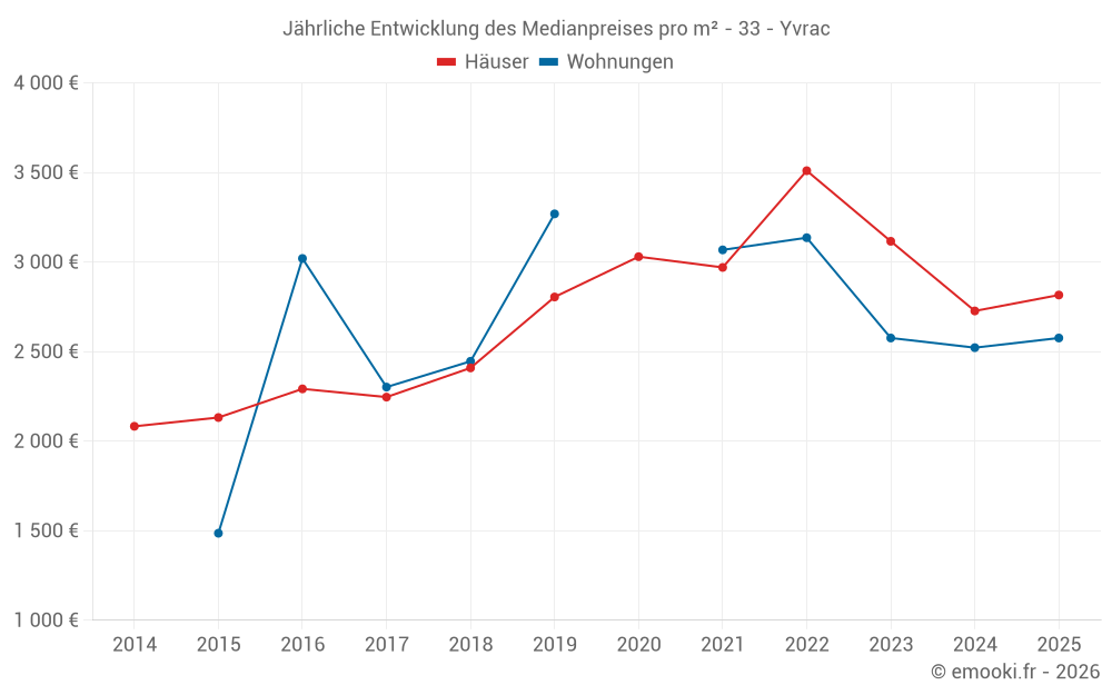 Der Durchschnittspreis auf den 24 Hausgeschäften der letzten 12 Monate in der Gemeinde Yvrac betrug 2 850 € pro Quadratmeter für einen mittleren Immobilienwert von 257 500 €. Über diesen Zeitraum hinweg lagen 60% der Transaktionen zwischen 2 449 und 3 702 € pro Quadratmeter (vom 2. bis zum 8. Dezil).