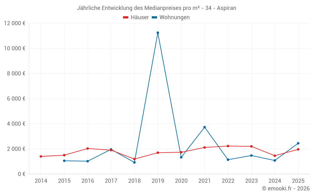 Der Durchschnittspreis auf den 20 Hausgeschäften der letzten 12 Monate in der Gemeinde Aspiran betrug 1 678 € pro Quadratmeter für einen mittleren Immobilienwert von 123 925 €. Über diesen Zeitraum hinweg lagen 60% der Transaktionen zwischen 1 160 und 2 771 € pro Quadratmeter (vom 2. bis zum 8. Dezil).